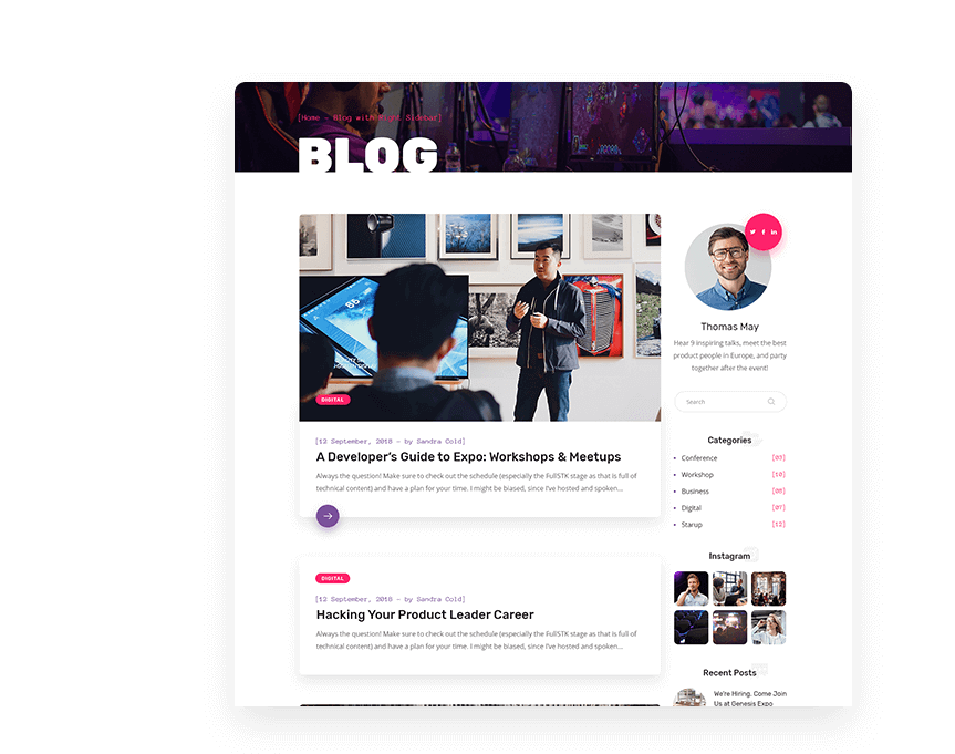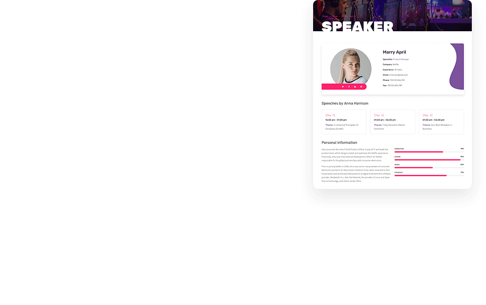 Present all the speakers and participants in GenesisExpo`s beautiful layouts. Choose your favorite variant of layout and create your own. You can create also single speaker profile with all relevant information.