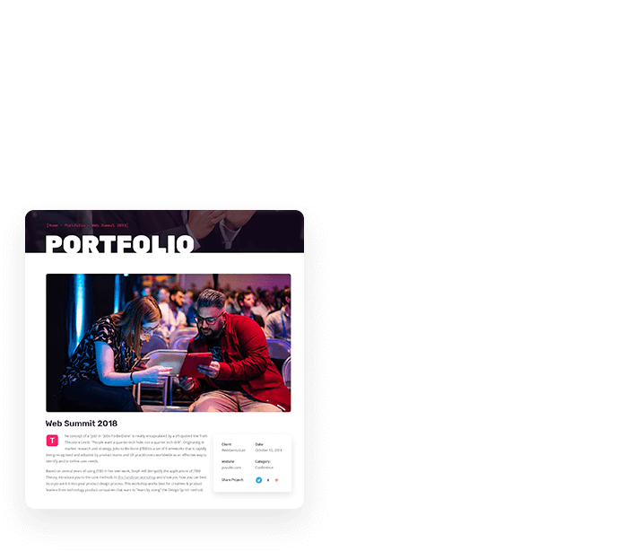 Show your gorgeous projects using our portfolio, which includes different styles like: gride, masonry. Masonry layout allows displaying projects as a fancy column-based. Grid is a perfect solution in case you need to display projects in columns.